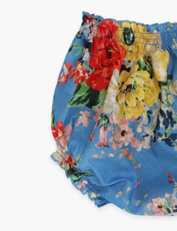 The Alight Bloomer in Blue Floral from our Resort Swim 2024 Collection. A cotton bloomer with elastic trims and frilled edges.