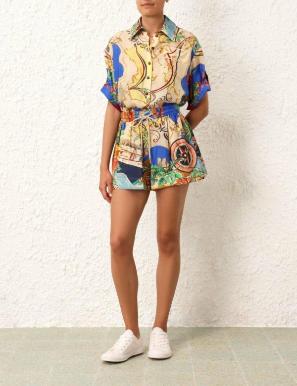 The Alight Draw Waist Short in Nautical Map from our Resort Swim 2024 Collection. A silk high waisted short featuring a placement print and an elasticated waistband.