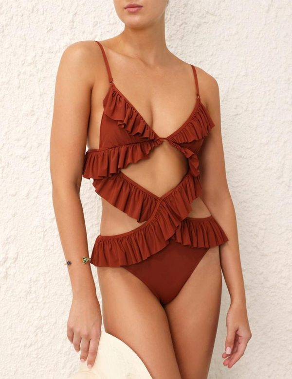 The Alight Gather Frill 1PC in Terracotta from our Resort Swim 2024 Collection. A lycra tie up one piece featuring frills throughout.