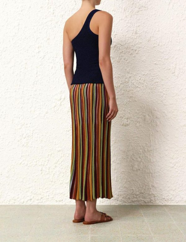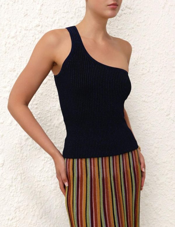 The Alight Lurex One Shoulder Top in Navy Lurex from our Resort Swim 2024 Collection. A one shoulder top constructed from a bright rayon lurex knit.