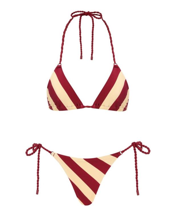 The Alight Rope Trim Mini Tri in Ruby/Cream Stripe from our Resort Swim 2024 Collection. An Italian lycra bikini set featuring a triangle top and low cut pant with self tie rope straps.