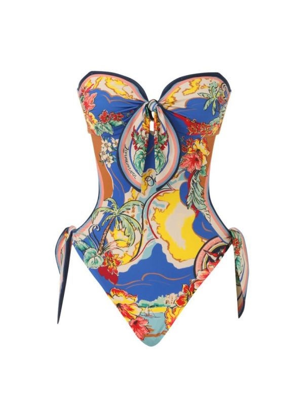 The Alight Scarf Tie 1PC in Nautical Map from our Resort Swim 2024 Collection. A lycra one piece featuring front and side tie details.