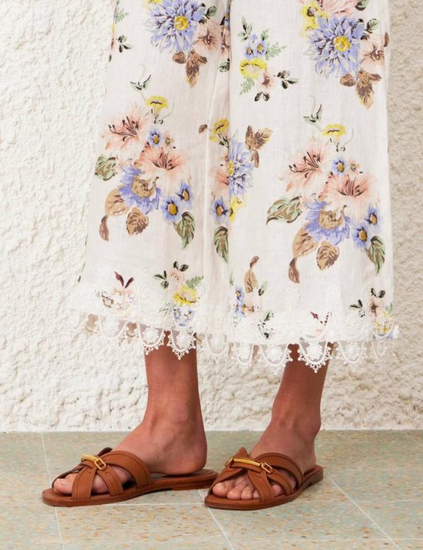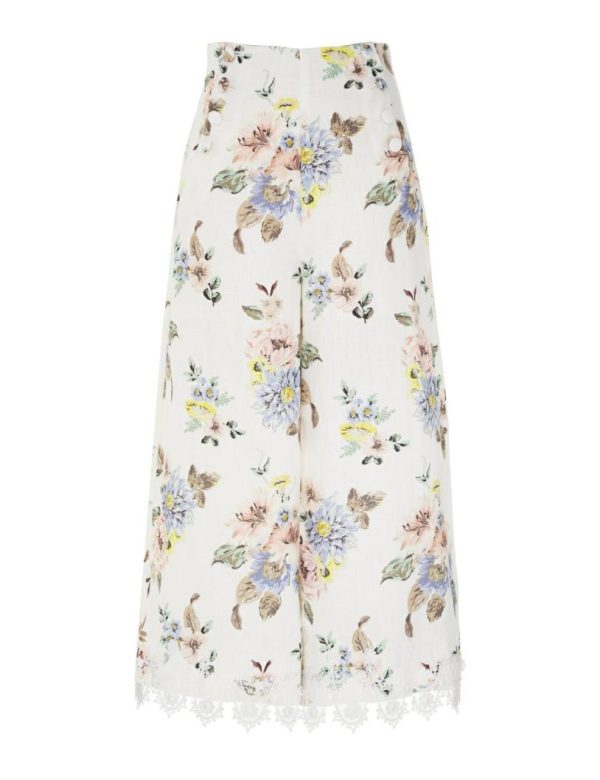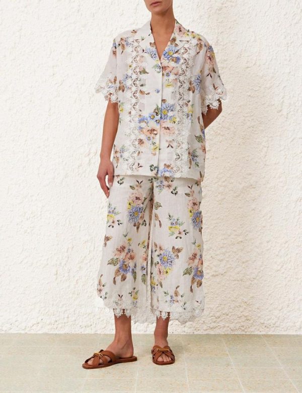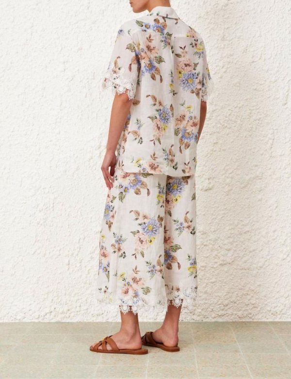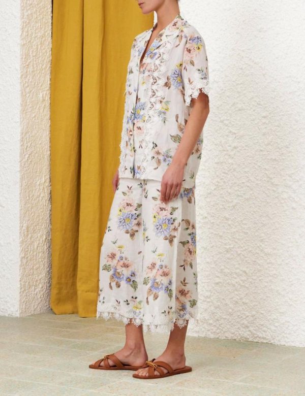The Applique Culottes in Blue Floral from our Resort 2024 Collection, Matchmaker. A linen culotte featuring a fixed high waist and lace trims throughout.