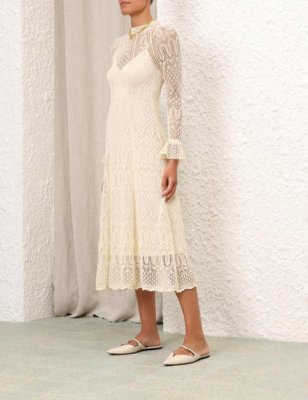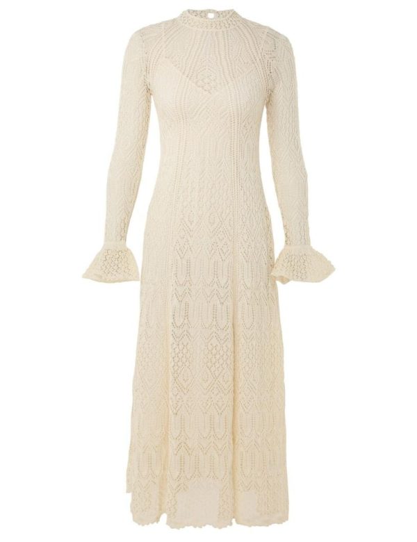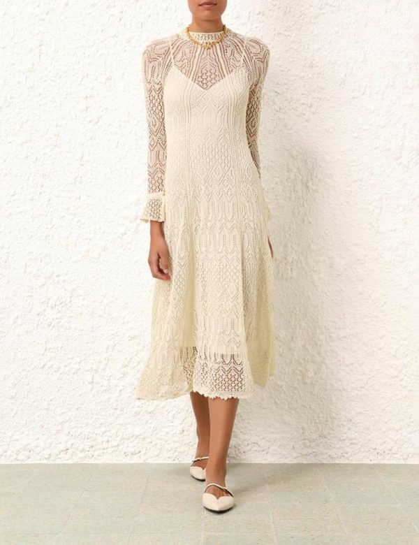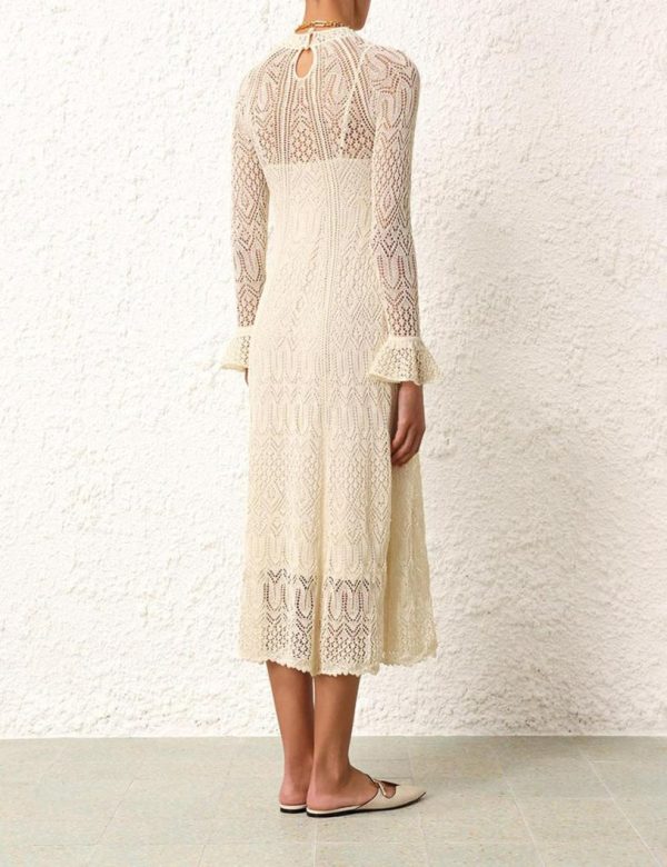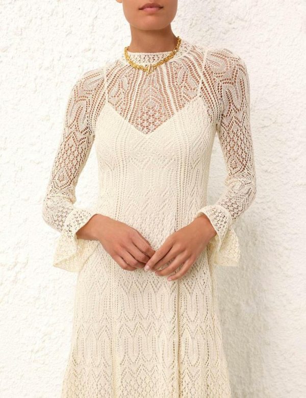 The August Lace Knit Dress in Ivory from our Resort Swim 2024 Collection. A lace long sleeve dress constructed from a Japanese yarn featuring a cuff frill trim.