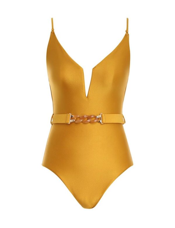 The August Plunge V Wire 1PC in Honey from our Resort Swim 2024 Collection. A lycra one piece featuring a removable belt, U-wire at the bust, boning at the side seams and adjustable straps.