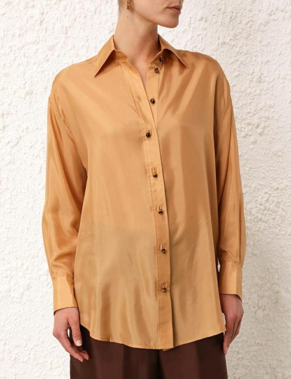 The August Relaxed Shirt in Biscuit from our Resort Swim 2024 Collection. A long sleeve silk shirt featuring buttons down the centre front and on the cuffs.