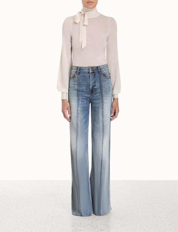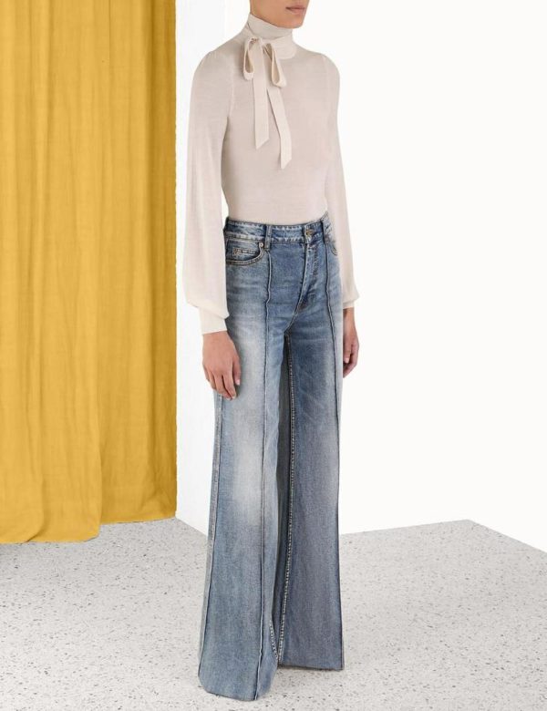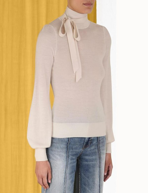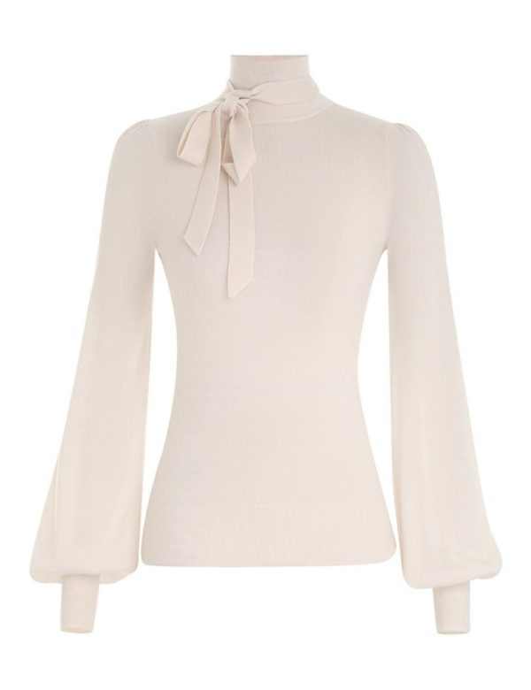 The Blouson Tie-Neck Sweater in Cream from our Fall 2023 Collection, Luminosity. A merino wool sweater featuring a self tie V-neckline and a fitted, ribbed hem and cuffs.