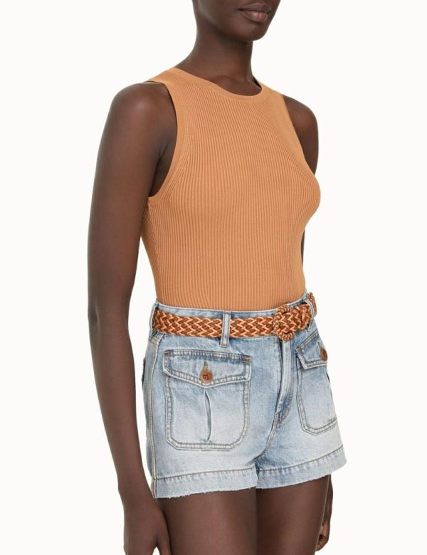 The Braided Leather Jean Belt in Brandy/Tan from our Summer Swim 2023 Collection. A braided belt featuring strands of contrast leather and a rounded buckle.