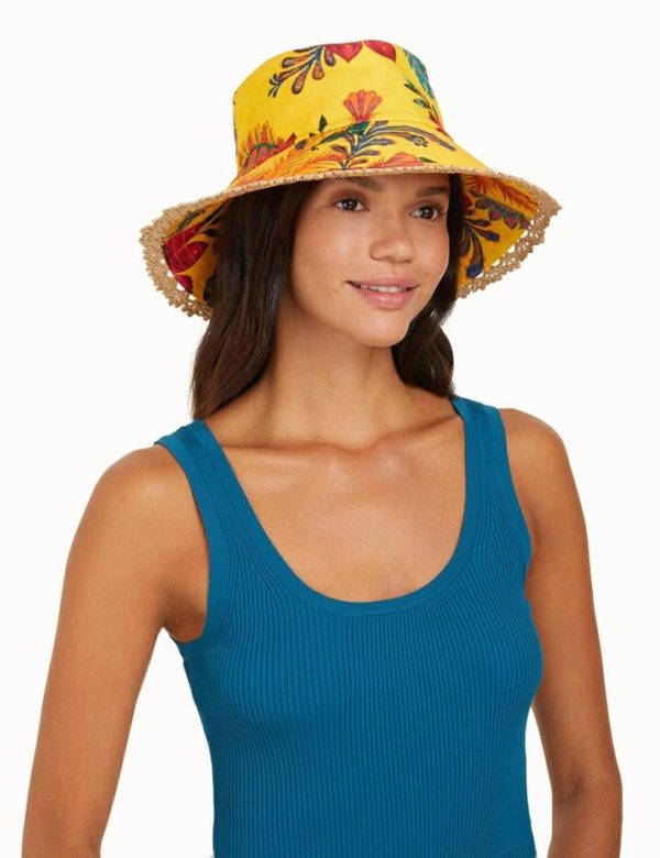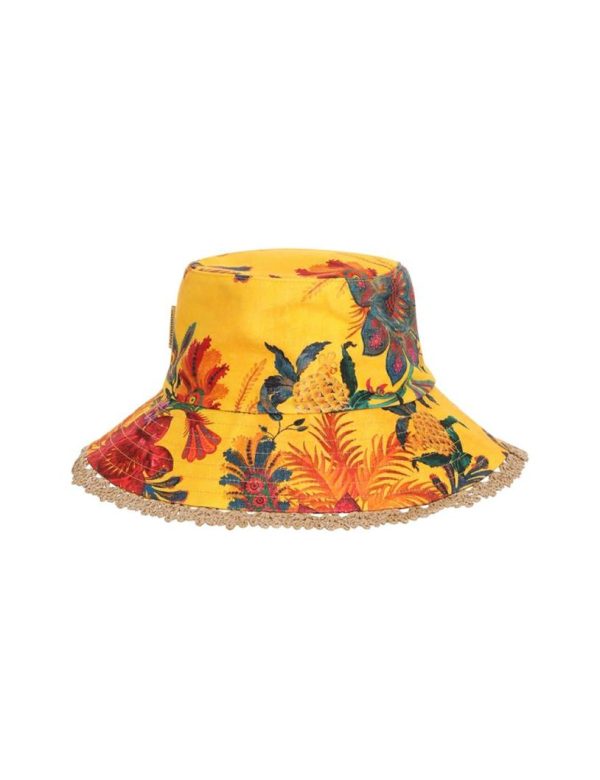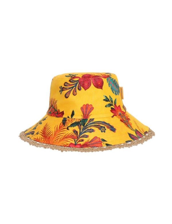 The Bucket Hat in Yellow Floral from our Summer Swim 2023 Collection. A linen bucket hat featuring topstitching around the brim and ventilation in the crown.