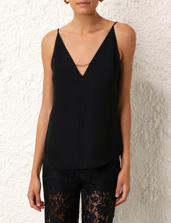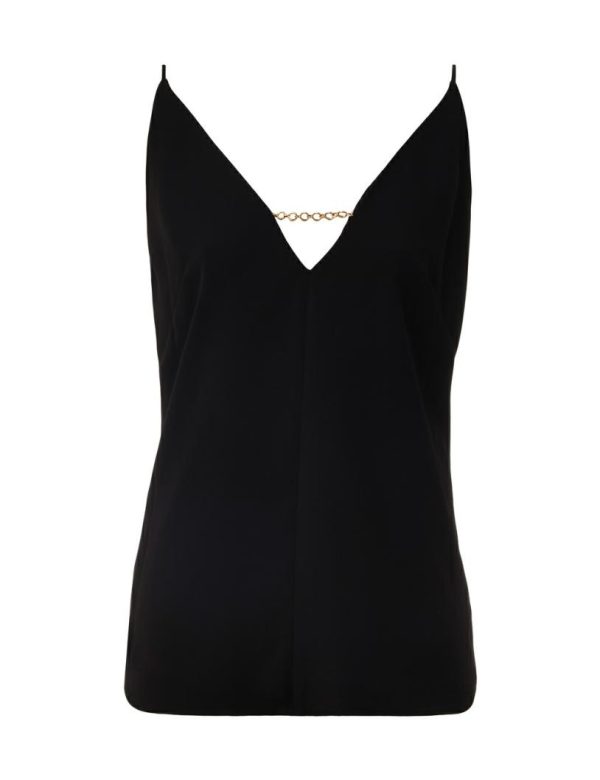 The Chain Tank in Black from our Resort 2024 Collection, Matchmaker. A twill top featuring a V-neckline with a gold chain detail.