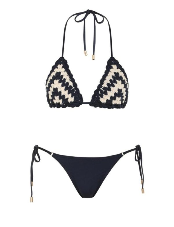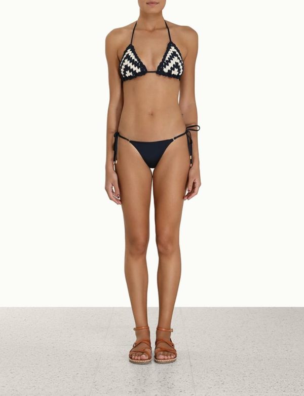 The Chintz Chevron Crochet Bikini in Cream/Navy from our Summer Swim 2023 Collection. An Italian lycra bikini set featuring a triangle top with chevron crochet throughout and low cut pants with side ties.