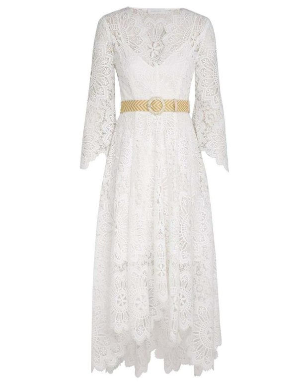 The Chintz Doily Lace Dress in Ivory from our Summer Swim 2023 Collection. A midi dress featuring doily lace throughout, finished with an asymmetric hem and scalloped edges.