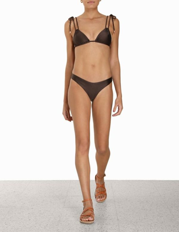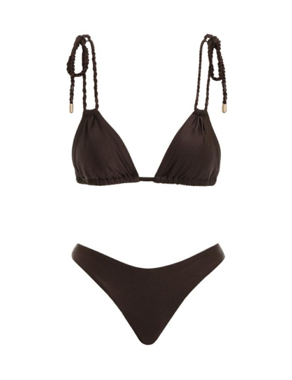The Chintz Rope Trim Bikini in Dark Chocolate from our Summer Swim 2023 Collection. An Italian lycra triangle bikini set featuring self tie rope straps and V cut bottoms.