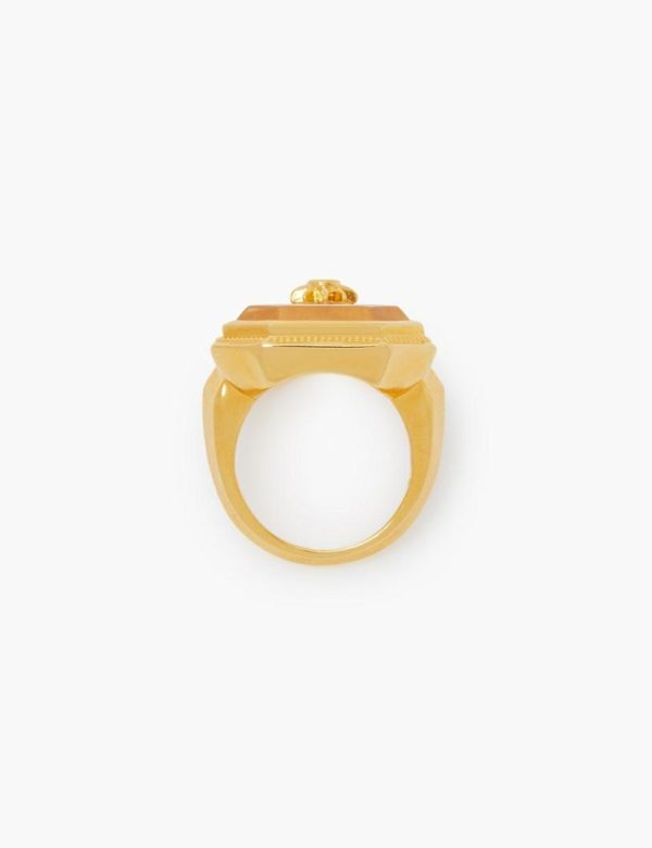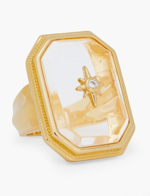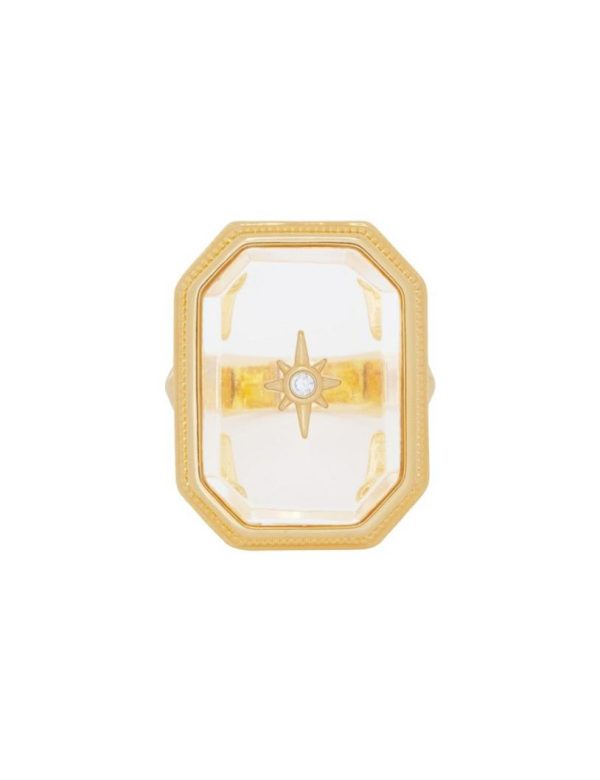 The Crystal Signet Ring in Gold/Transparent Quartz from our Fall 2023 Collection, Luminosity. A gold pleated ring featuring transparent quartz and a cubic zirconia stone.