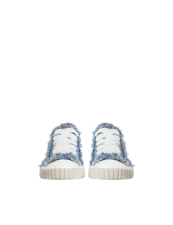 The Denim Lo-Top in Denim from our Summer Swim 2023 Collection. A lace-up sneaker featuring frayed edges.