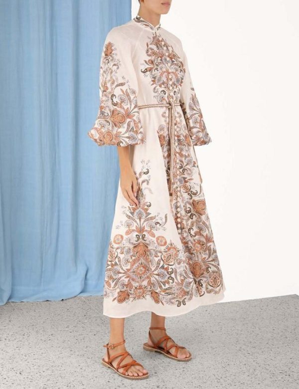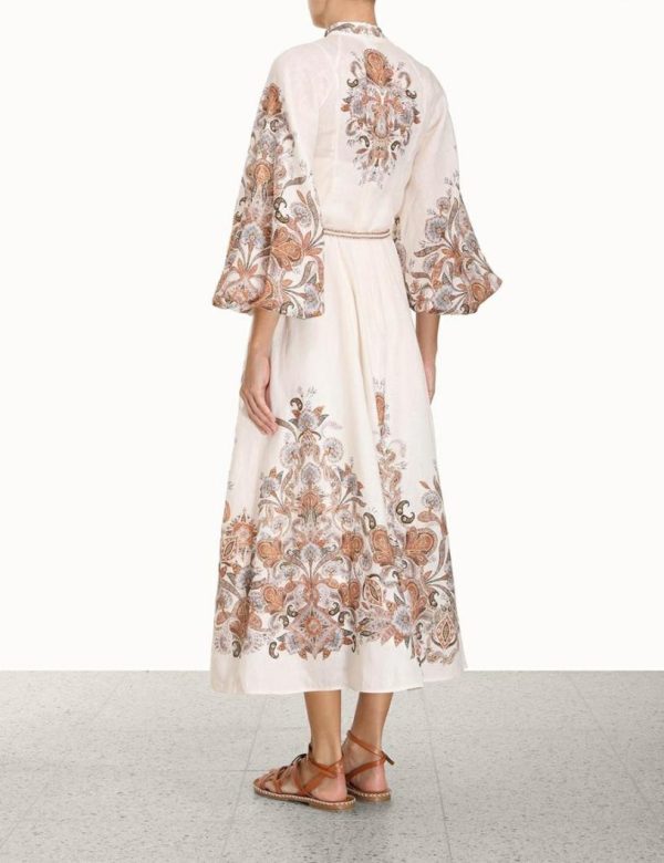 The Devi Billow Long Dress in Ivory Paisley from our Summer Swim 2023 Collection. A linen midi dress with fitted bodice, A-line skirt and exaggerated sleeves.