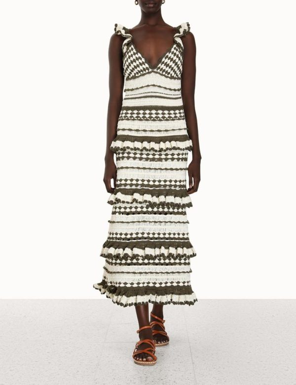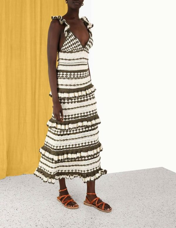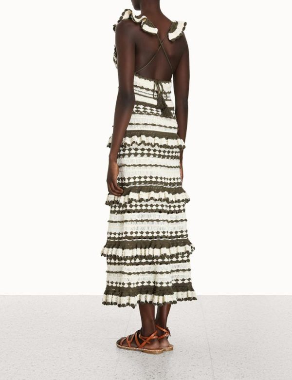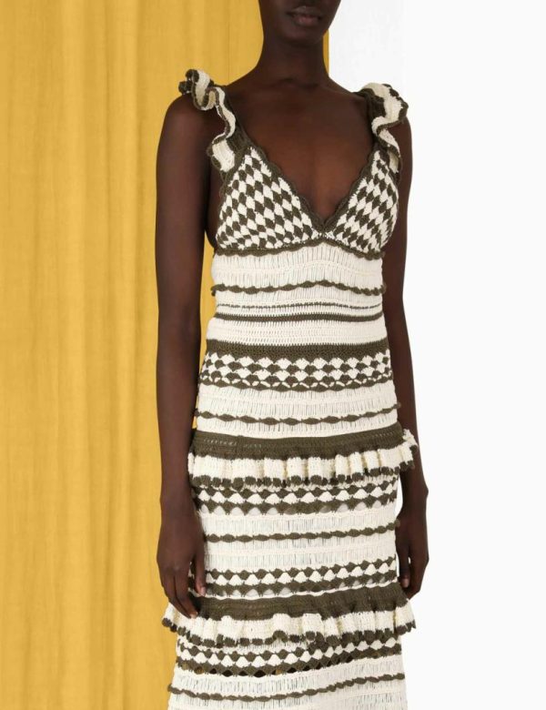 The Devi Crochet Frill Dress in Khaki Cream from our Summer Swim 2023 Collection. A crochet midi dress featuring frilled shoulder straps and a self tie, cutaway back.