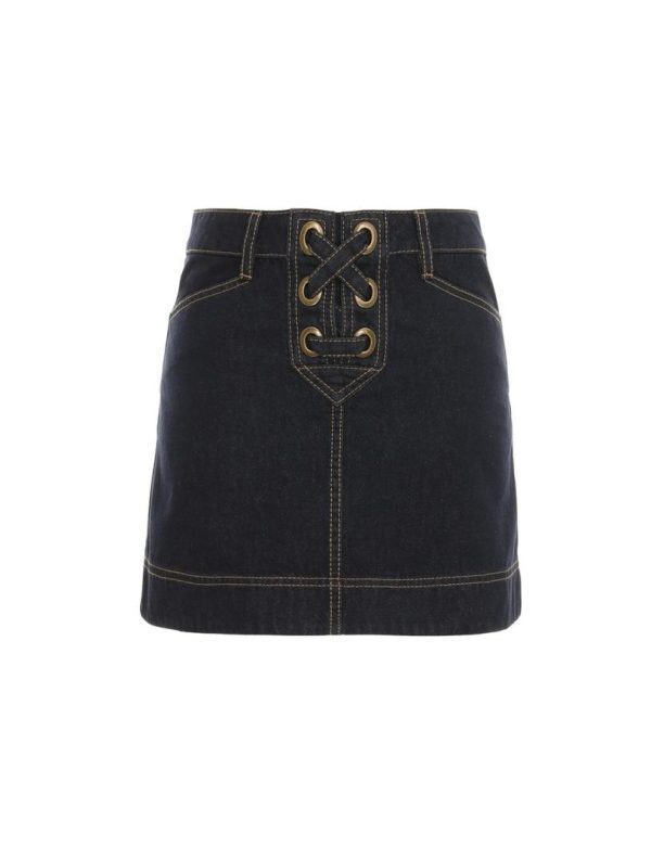 The Devi Lace Up Skirt in Midnight from our Summer Swim 2023 Collection. A denim mini skirt with lacing panels at centre front, angled front pockets, back pockets, and top stitching throughout.