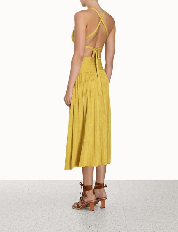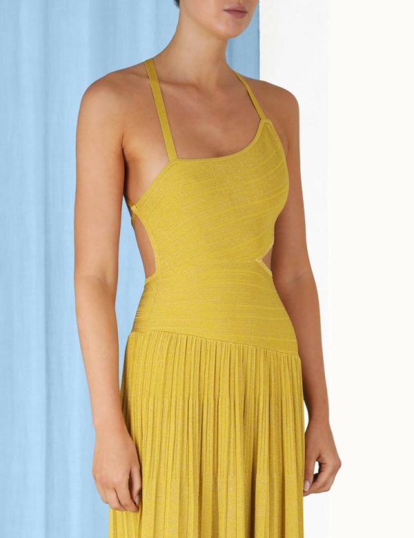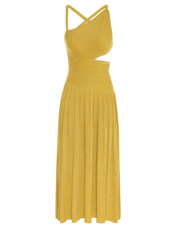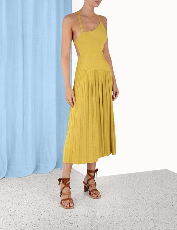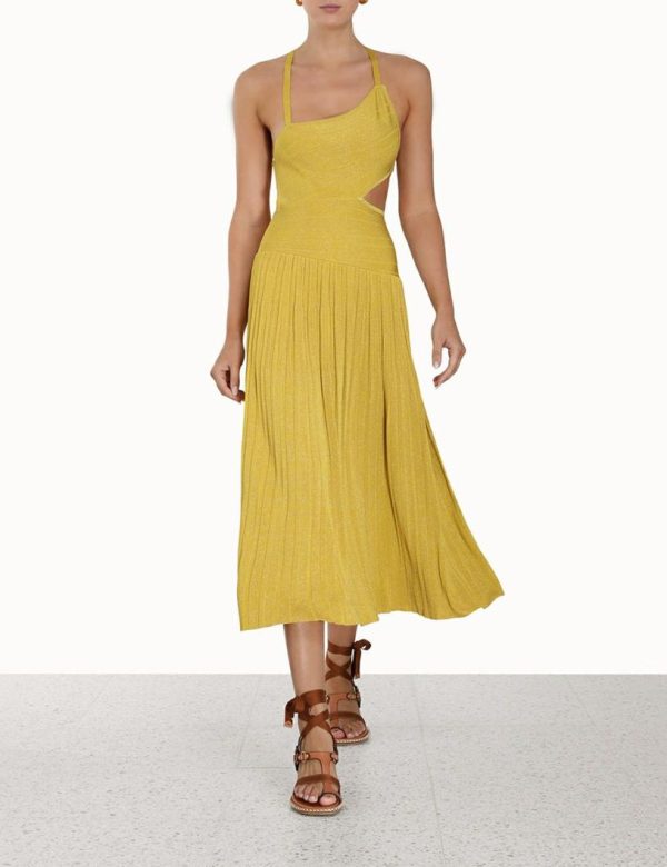 The Devi Lurex Midi Dress in Mustard from our Summer Swim 2023 Collection. A midi dress featuring an asymmetric neckline and cutaway back, finished with threads of lurex throughout.