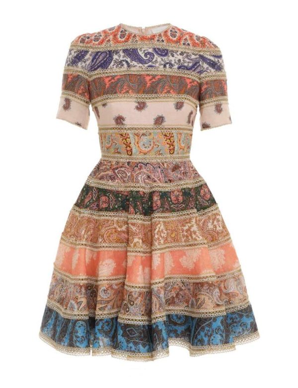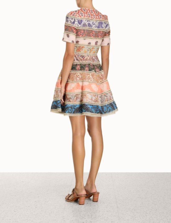 The Devi Spliced Mini Dress in Spliced from our Summer Swim 2023 Collection. A linen mini dress featuring a fitted bodice and full skirt, finished with lace trims throughout.