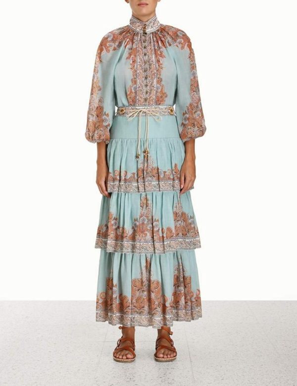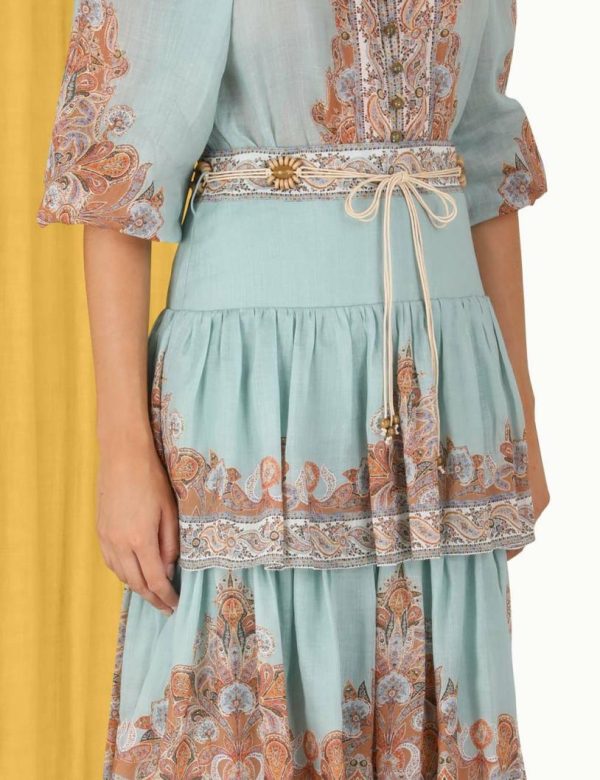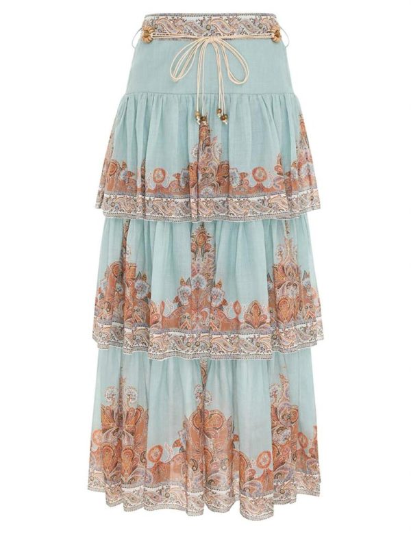 The Devi Tiered Skirt in Mint Paisley from our Summer Swim 2023 Collection. A ramie midi skirt featuring a drop waist and frilled tiers with picot edging throughout.