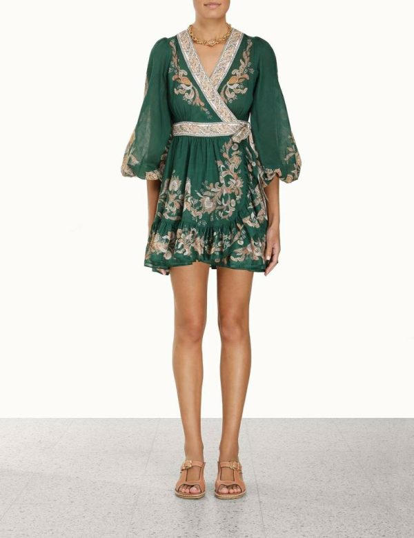 The Devi Mini Dress in Emerald / Paisley from our Summer Swim 2023 Collection. A cotton mini dress featuring a wrap front silhouette and a self tie belted waist.