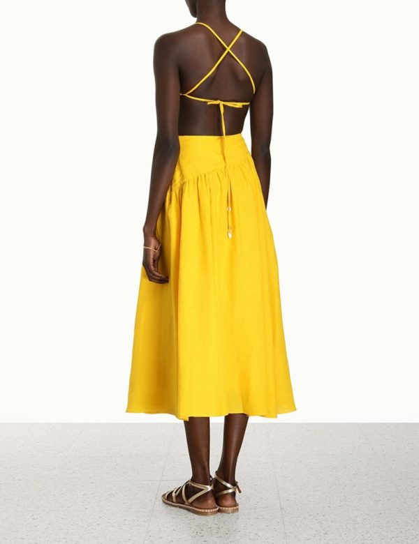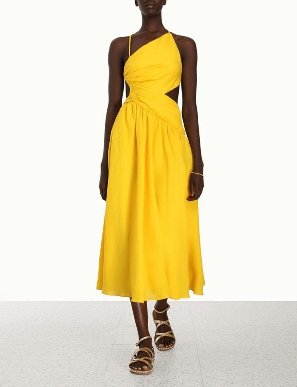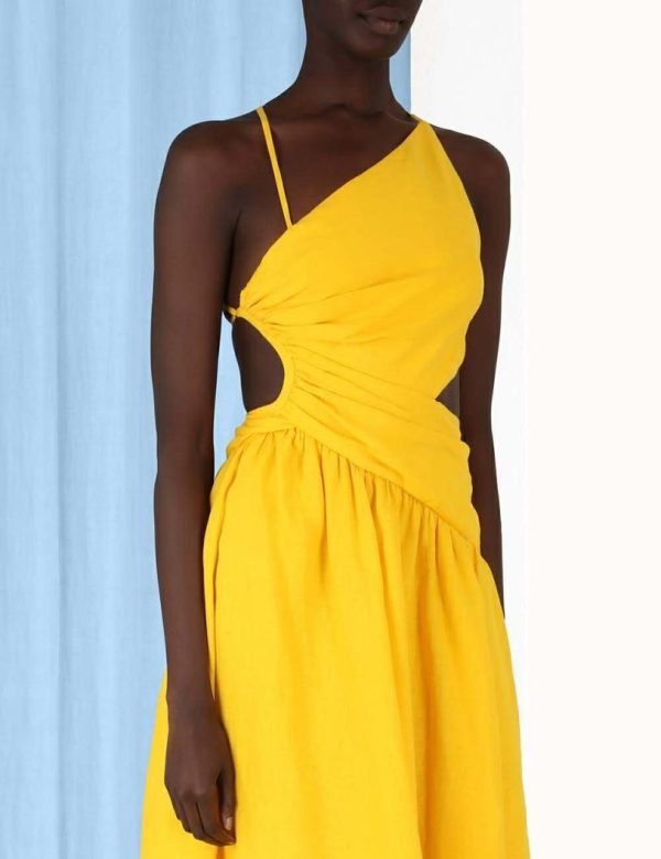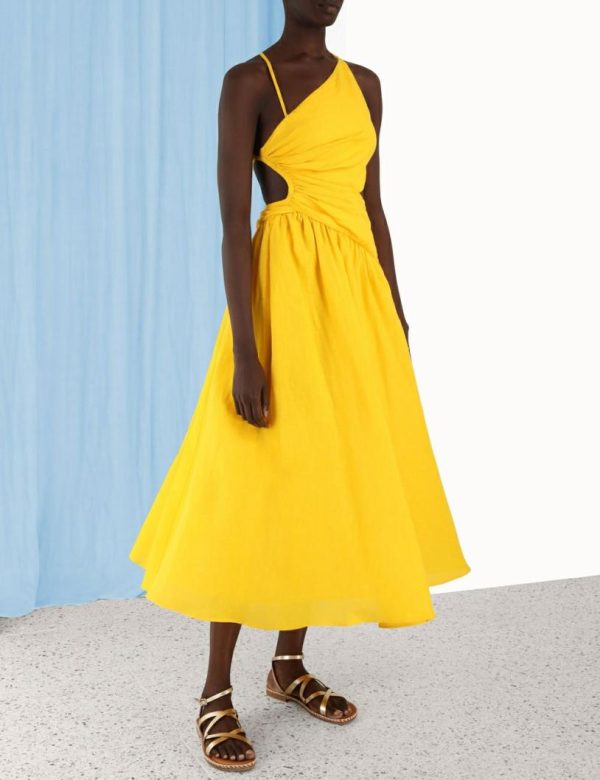 The Ginger Asymmetric Midi Dress in Marigold from our Summer Swim 2023 Collection. A lightweight linen midi dress featuring waist cut outs, ruching throughout and an open self tie back.