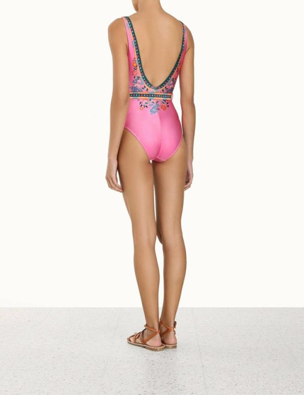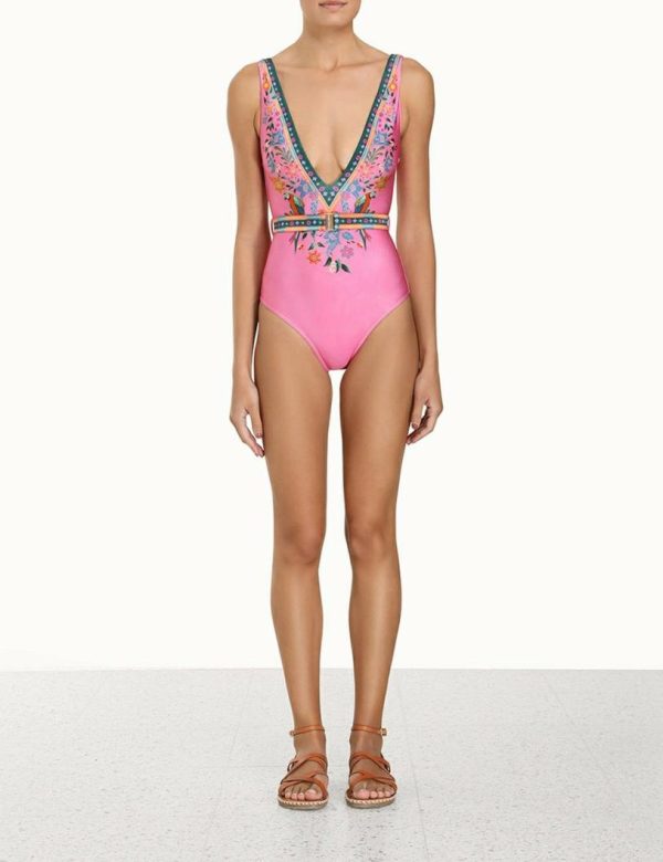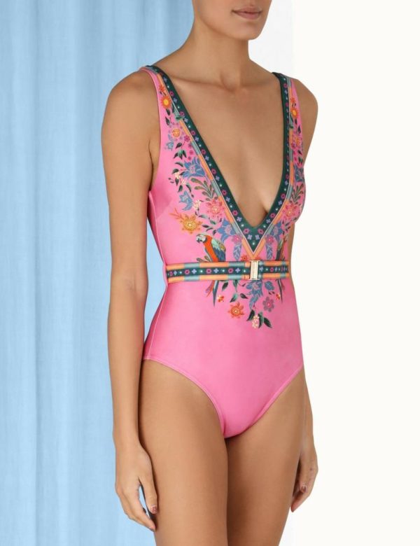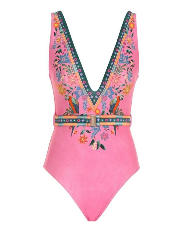 The Ginger Belted Plunge 1PC in Pink Multi from our Summer Swim 2023 Collection. A lycra plunging one piece featuring a bar tack clip belt.