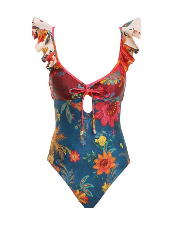 The Ginger Frill Shoulder 1PC in Spliced from our Summer Swim 2023 Collection. An Italian lycra one piece featuring a frilled shoulders and tie front bust.