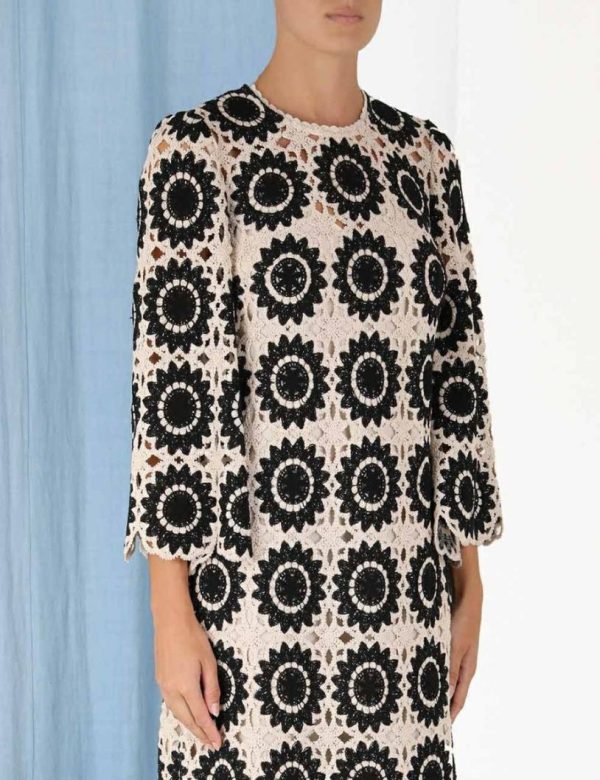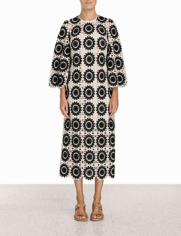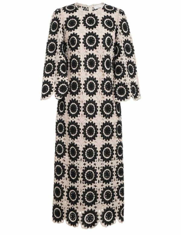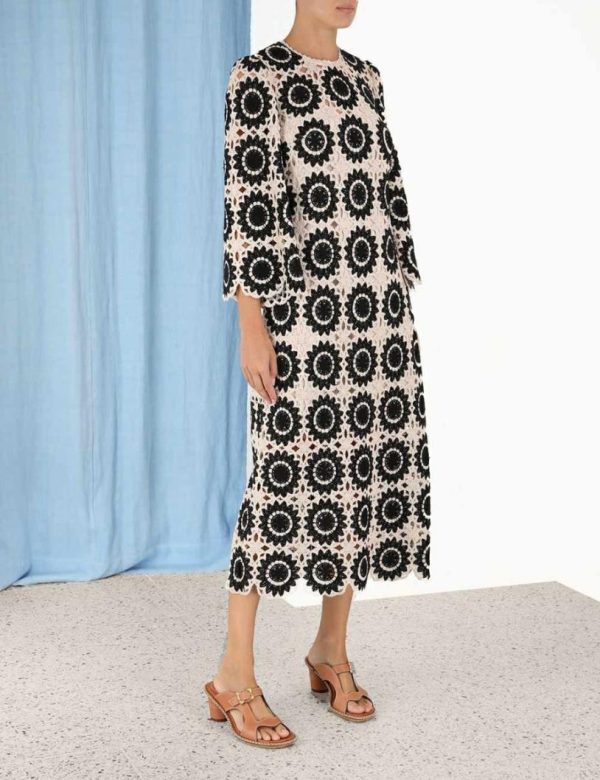 The Ginger Lace Midi Dress in Cream/Black from our Summer Swim 2023 Collection. A lace midi dress featuring a scalloped hem and sleeve, an invisible zip at the centre back and gathering at the sleeve head.