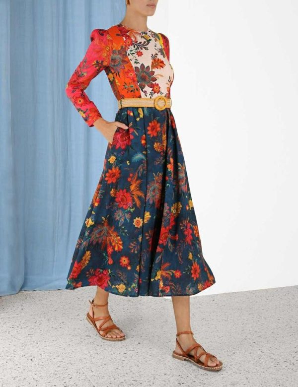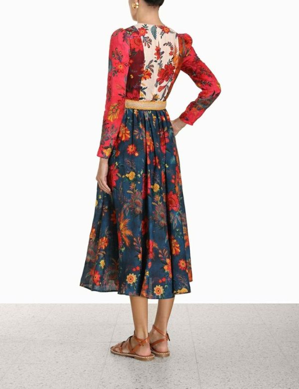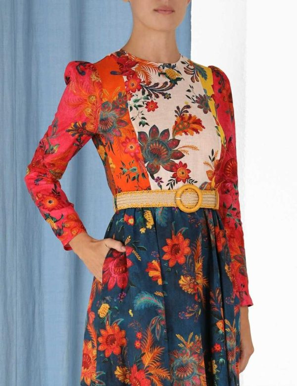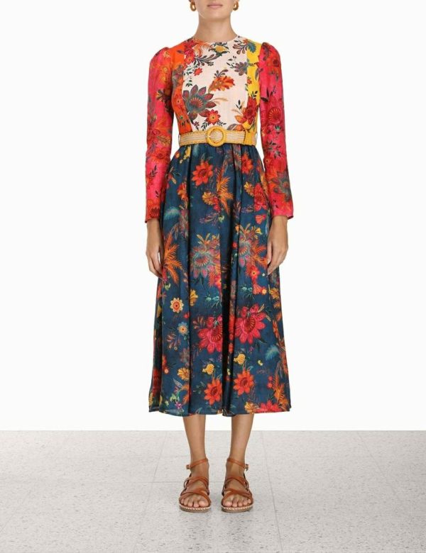 The Ginger Long Sleeve Midi Dress in Spliced from our Summer Swim 2023 Collection. A linen midi dress featuring long sleeves, a raffia belt and spliced prints throughout.
