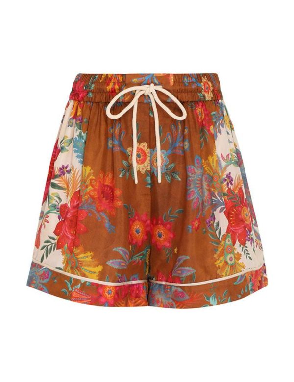 The Ginger Relaxed Short in Cream/Brown Floral from our Summer Swim 2023 Collection. A silk short featuring an elastic waistband with drawstring and contrast piping.