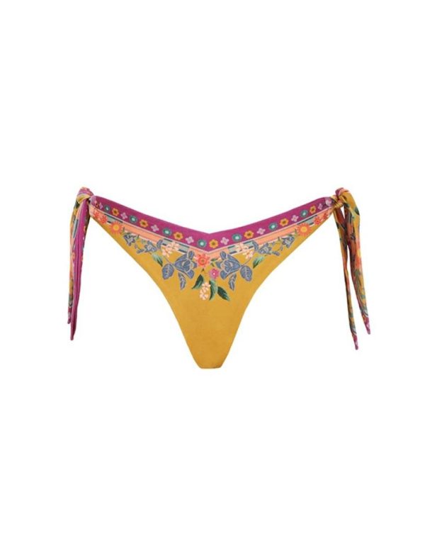 The Ginger Scarf Tie Pant in Mustard Multi from our Summer Swim 2023 Collection.A low rise bikini pant constructed from Italian lycra, featuring tie details at the side waist.