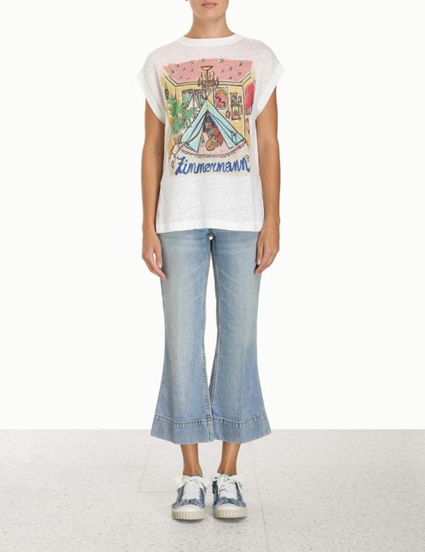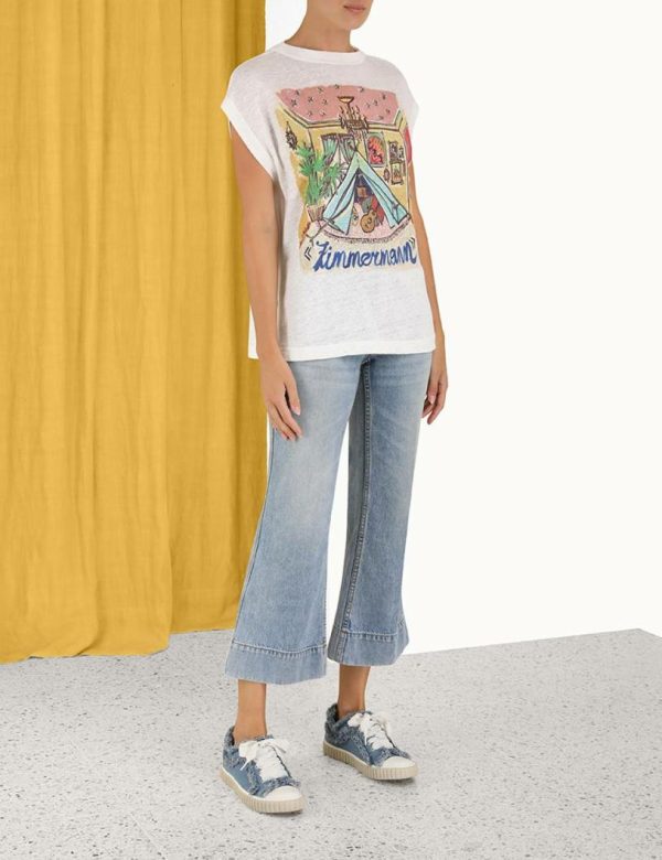The Ginger Sleeveless Tee in Ivory from our Summer Swim 2023 Collection. A round neck, short sleeve tee with a ribbed neckline and ZIMMEMRANN artwork at centre front.