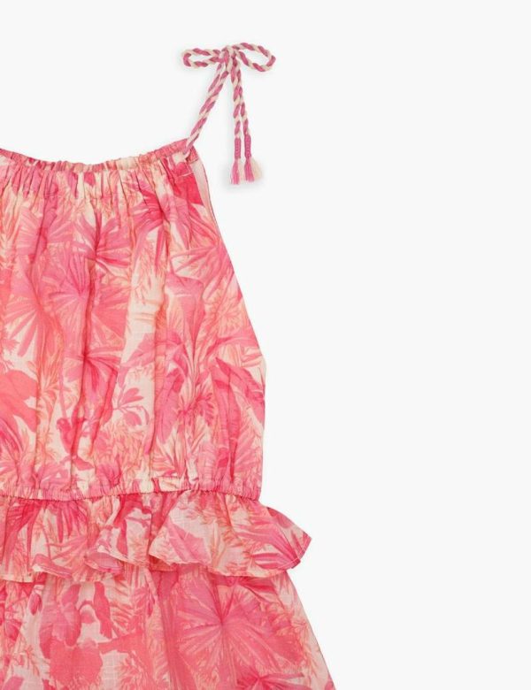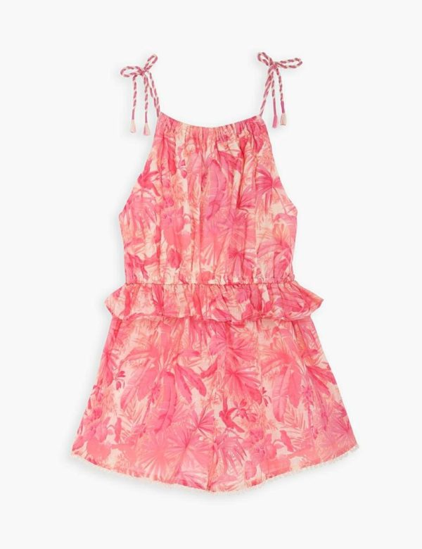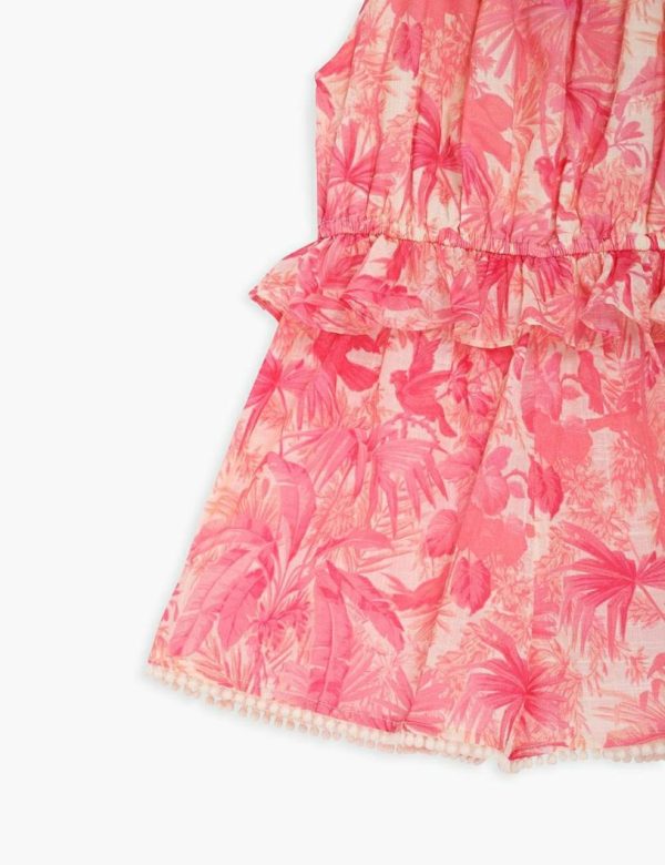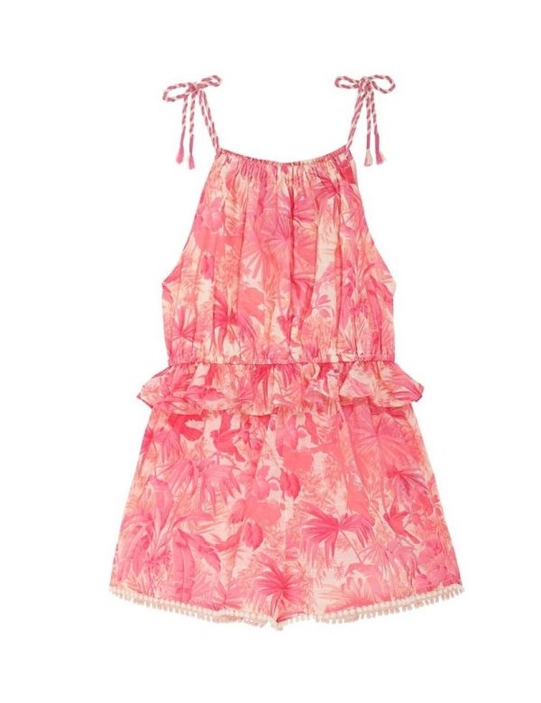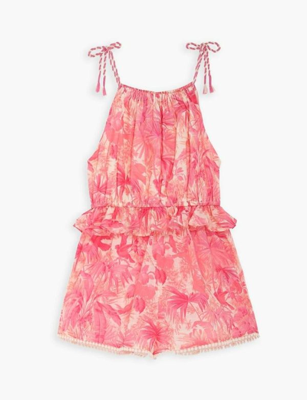 The Ginger Tie Shoulder Playsuit in Pink Palm from our Summer Swim 2023 Collection. A cotton playsuit featuring a drawstring neckline, tie shoulder straps and a peplum ruffle.