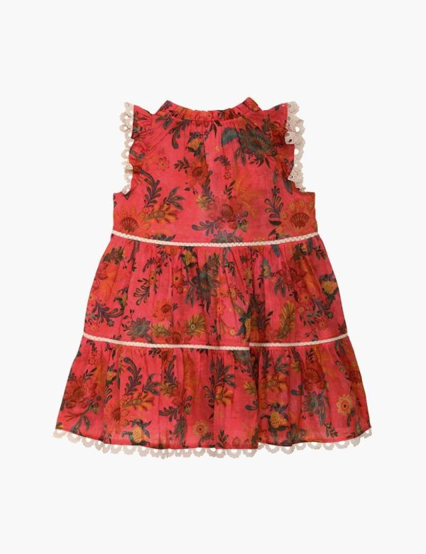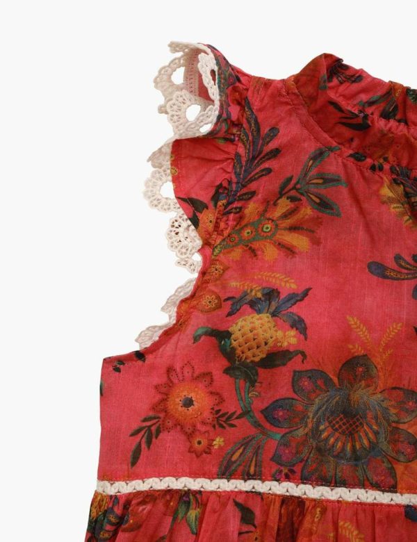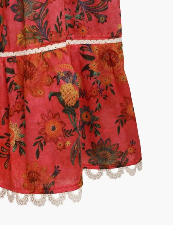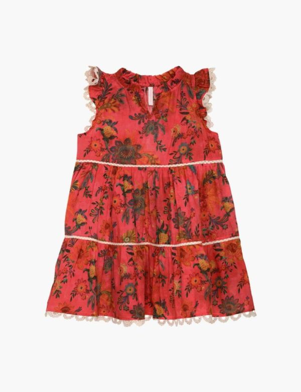 The Ginger Tier Dress in Hot Pink Floral from our Summer Swim 2023 Collection. A cotton tiered dress featuring frill details and crochet trims throughout.