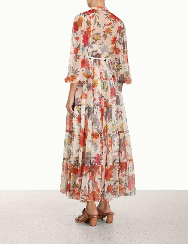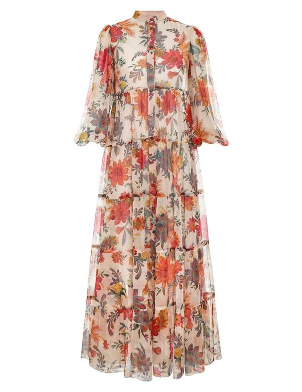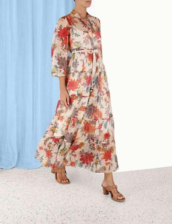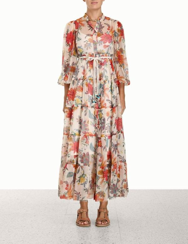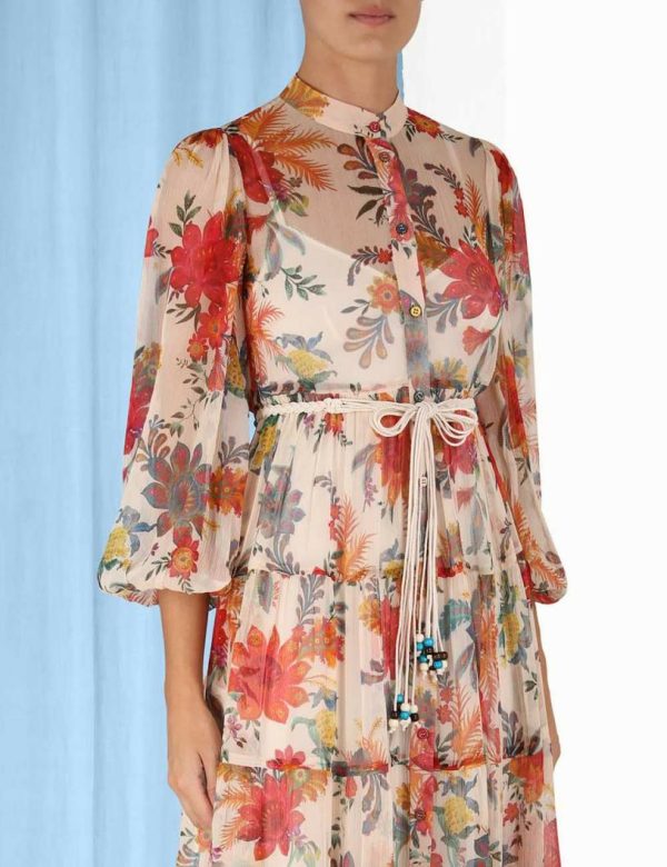 The Ginger Tiered Midi Dress in Cream Floral from our Summer Swim 2023 Collection. A silk maxi dress with gathered skirt tiers and blouson sleeves with elasticated cuffs.