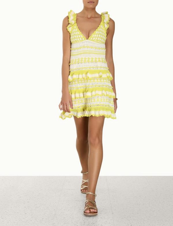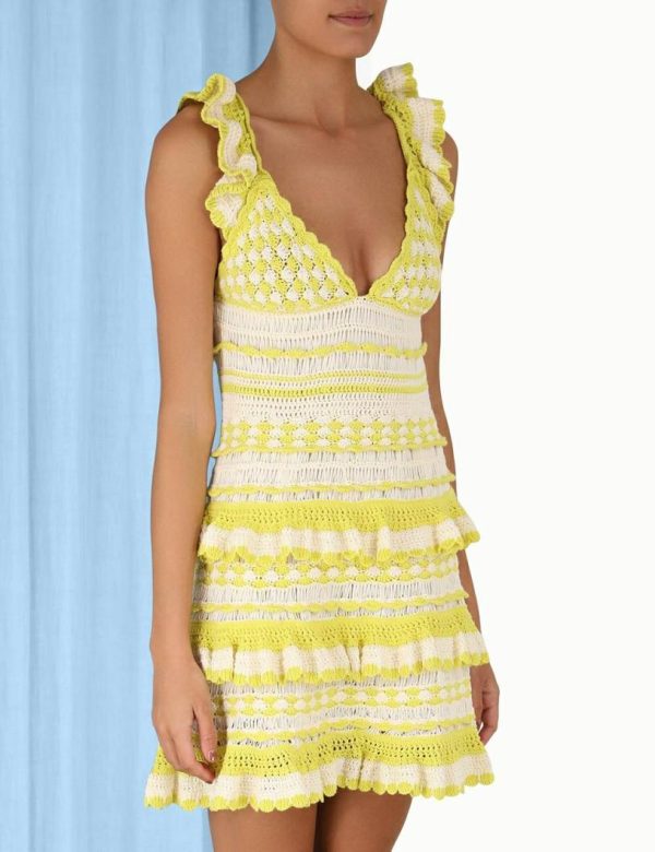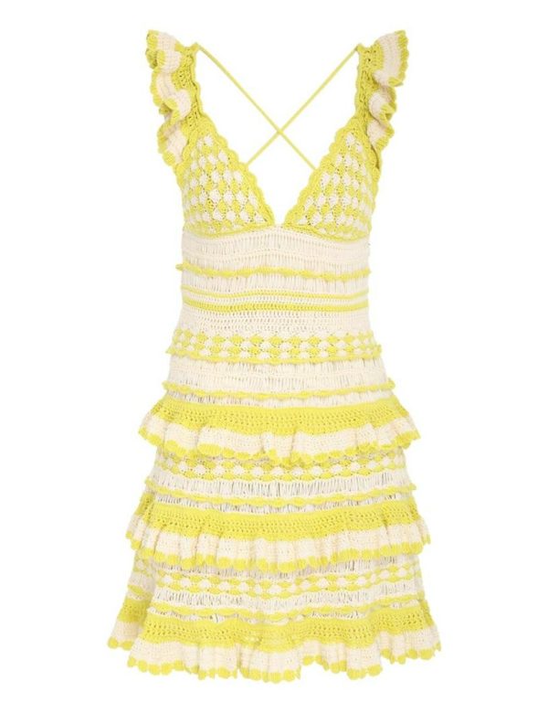 The Halcyon Crochet Frill Mini in Yellow Cream from our Summer Swim 2023 Collection. A crochet mini dress featuring frilled shoulder straps and a self tie, cutaway back.