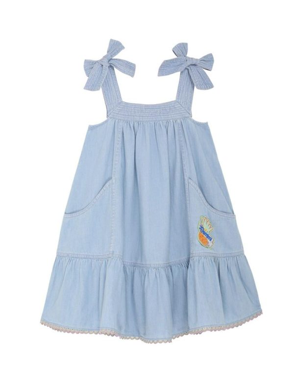 The Halcyon Denim Dress in Misty Blue from our Summer Swim 2023 Collection. A denim dress featuring self tie shoulders and drop frill hem, finished with an embroidered Zimmermann motif.