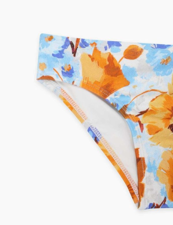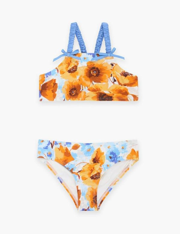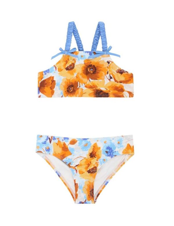 The Halcyon Gathered Strap Bikini in Orange/Blue Floral from our Summer Swim 2023 Collection. A lycra bikini set featuring elasticated straps and a placement print throughout.