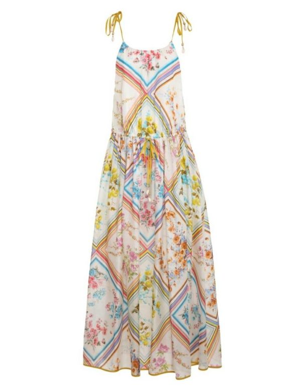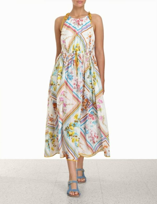 The Halcyon Halter Scarf Dress in Multi from our Summer Swim 2023 Collection. A silk midi dress featuring a halter neck bodice with self tie straps and a gathered skirt.
