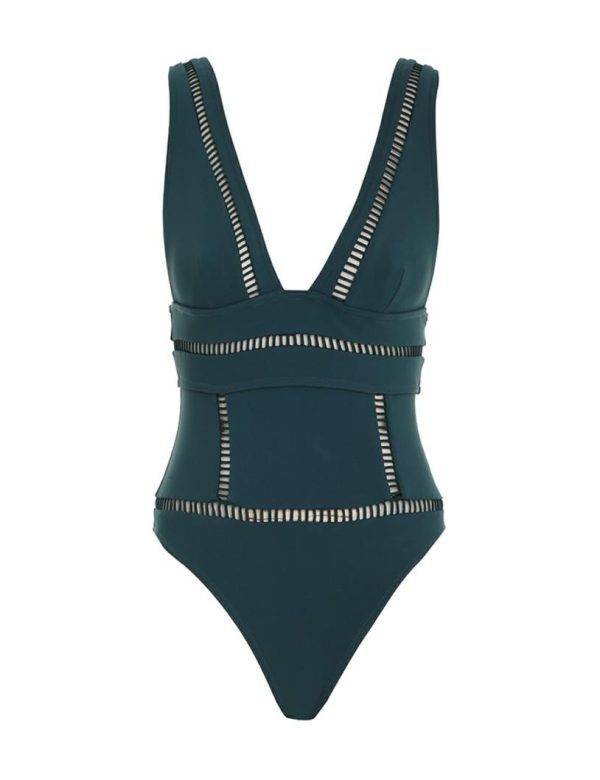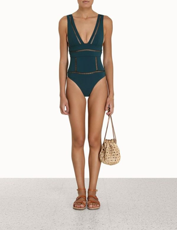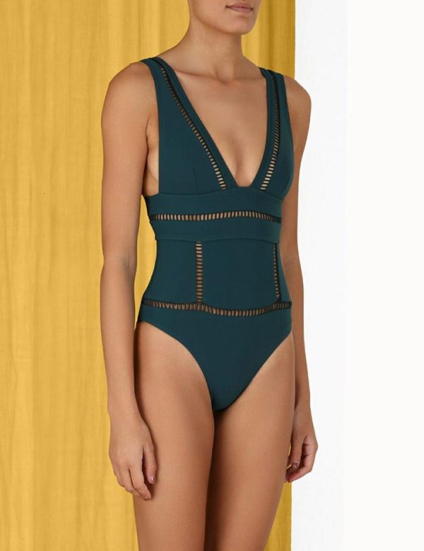 The Halcyon Ladder Trim 1PC in Teal from our Summer Swim 2023 Collection. An Italian lycra one piece featuring wide set straps, V-neckline and ladder insert trims throughout.