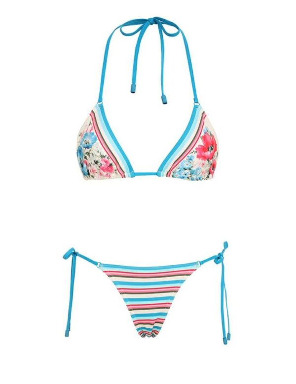 The Halcyon Mini Tri Bikini in Pink/Blue Floral from our Summer Swim 2023 Collection. An Italian lycra bikini set featuring a triangle top and low cut pant with self tie straps.
