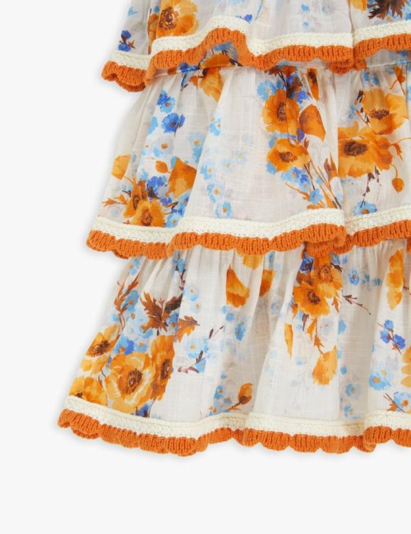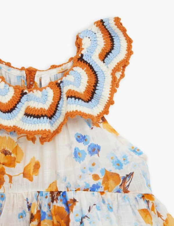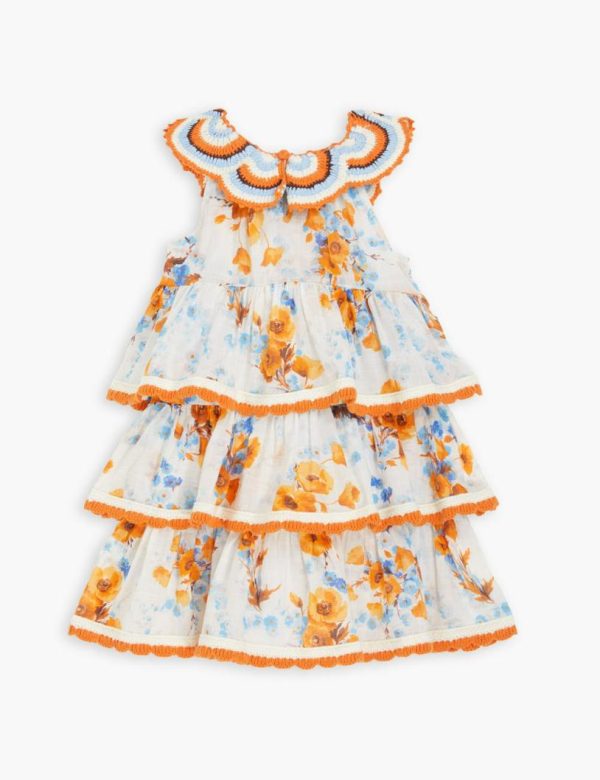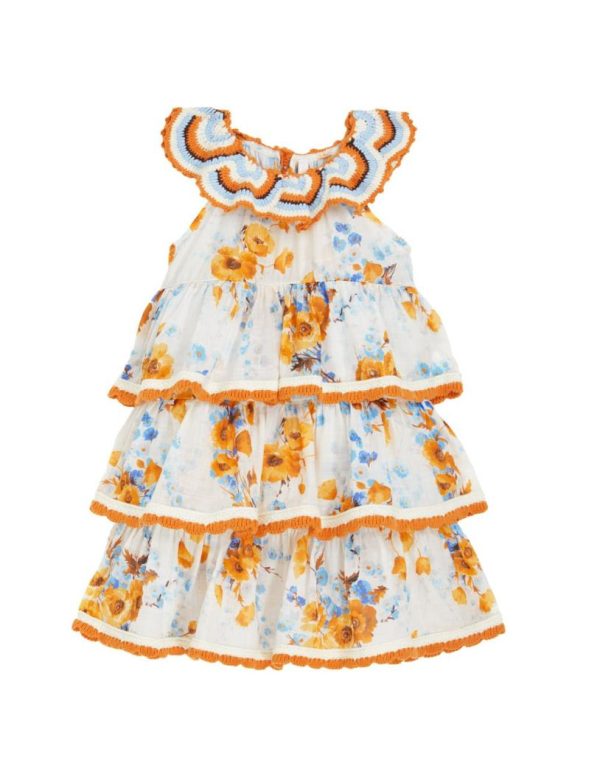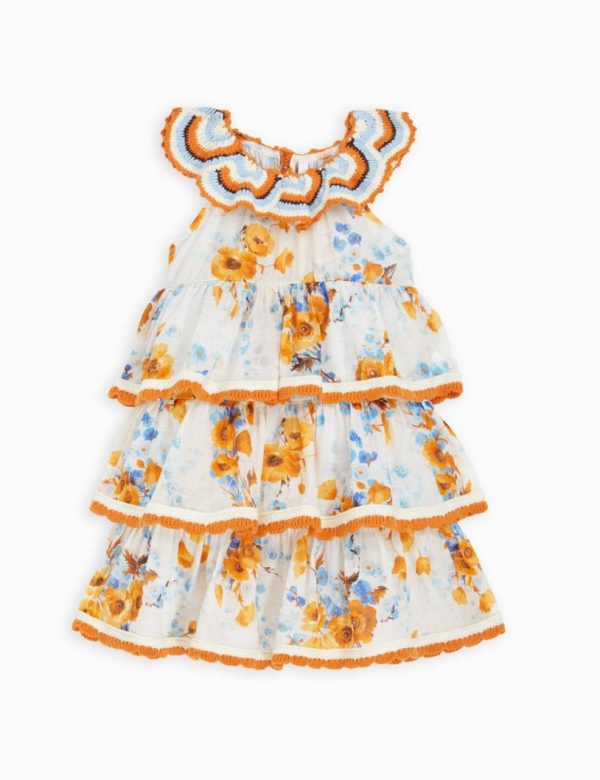 The Halcyon Scallop Crochet Dress in Multi from our Summer Swim 2023 Collection. A cotton dress featuring scalloped tiers and contrast crochet frills along the neckline.