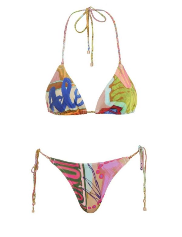 The Hawaii Tri Bikini in Hawaii from our Holiday 2023 Edit. An Italian lycra bikini set featuring a triangle top and low cut pant with self tie straps.