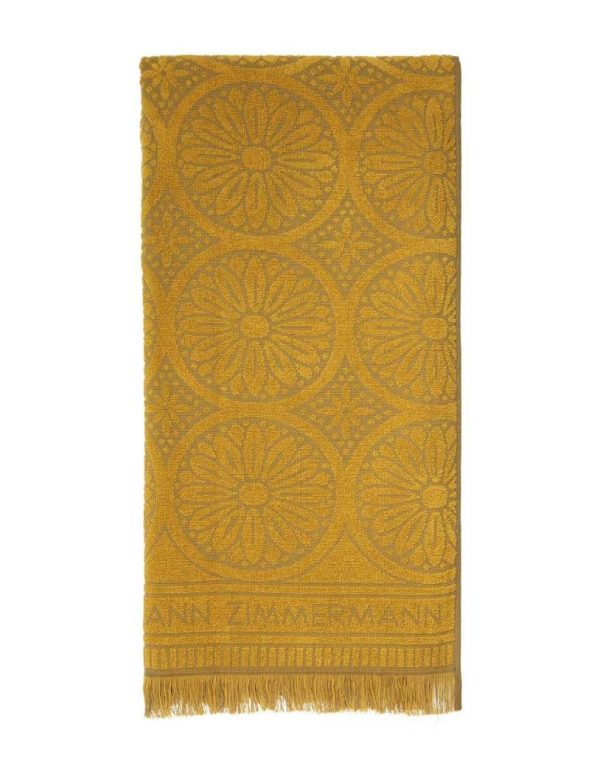 The Jacquard Towel in Gold from our Resort 2024 Collection, Matchmaker. A cotton jacquard towel with fringed edging and branded ends.