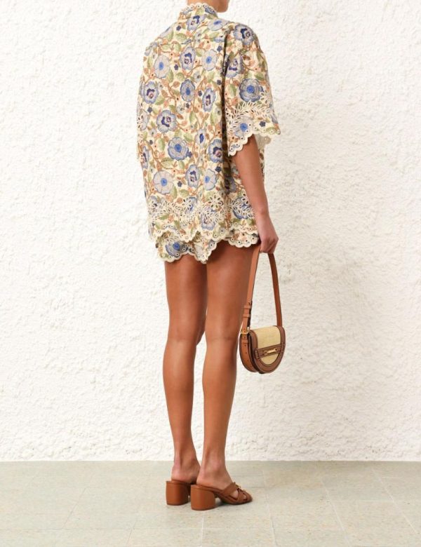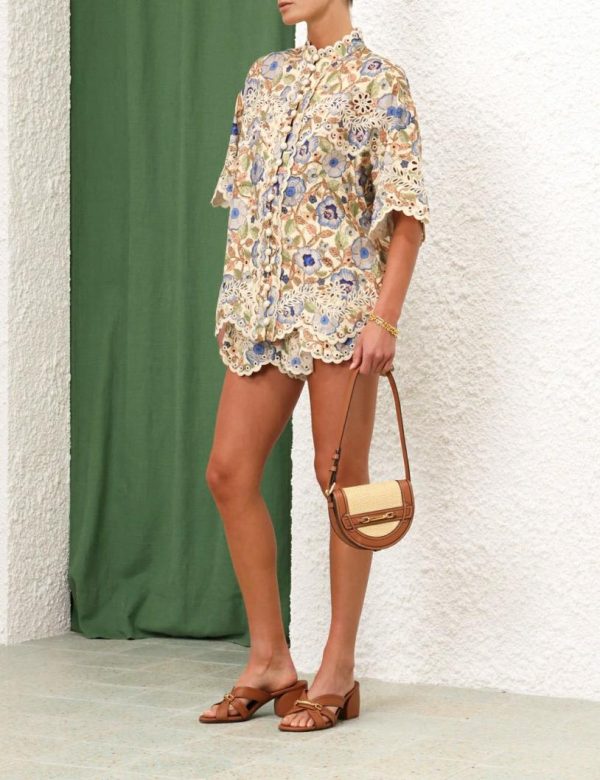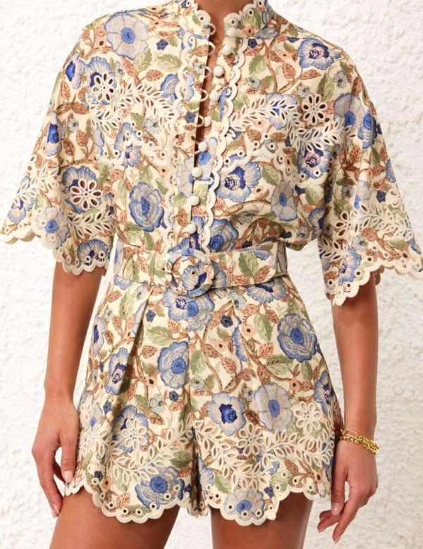 The Junie Embroidered Short in Ivory/Blue Floral from our Resort Swim 2024 Collection. A linen short featuring placement embroidery and a removable belt.