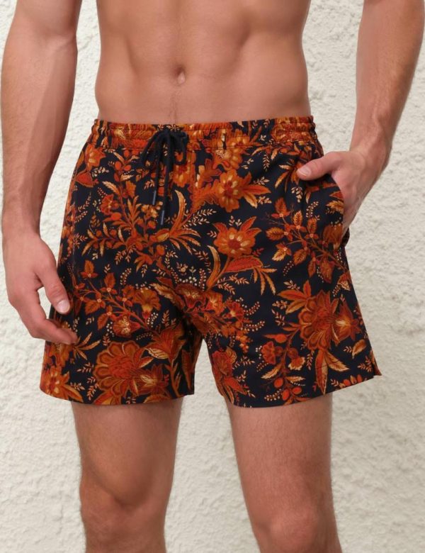The Mens Boardshort in Dark Navy Floral from our Resort Swim 2024 Collection. A printed boardshort with elasticated waistband, drawstring cord, side inseam pockets and inbuilt support mesh lining.
