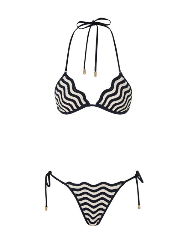 The Junie Textured Knit Bikini in Navy/Cream from our Resort Swim 2024 Collection. A knitted crochet bikini set featuring a wave edging with ties with toggle ends.