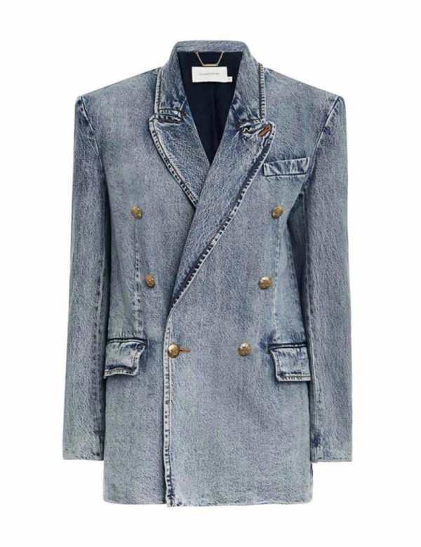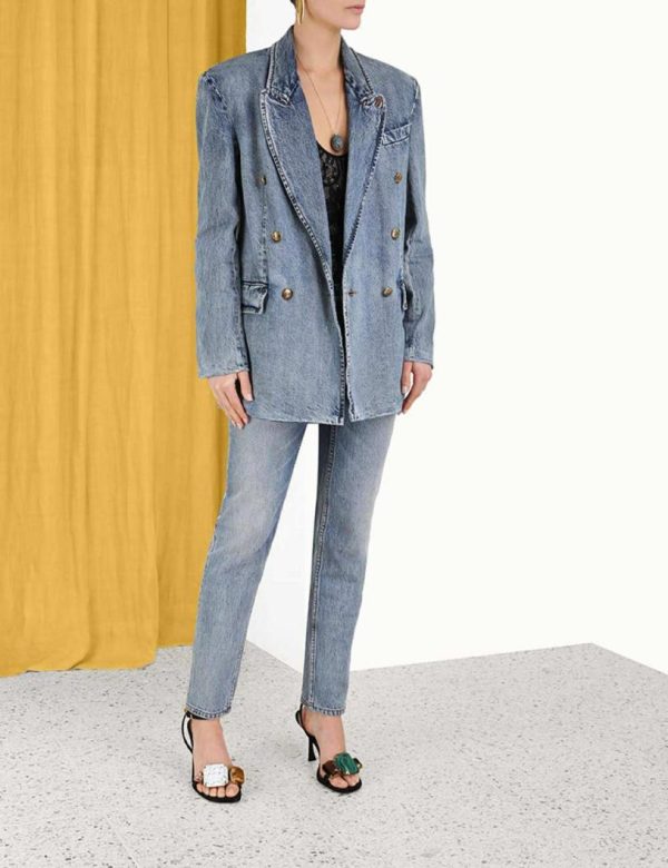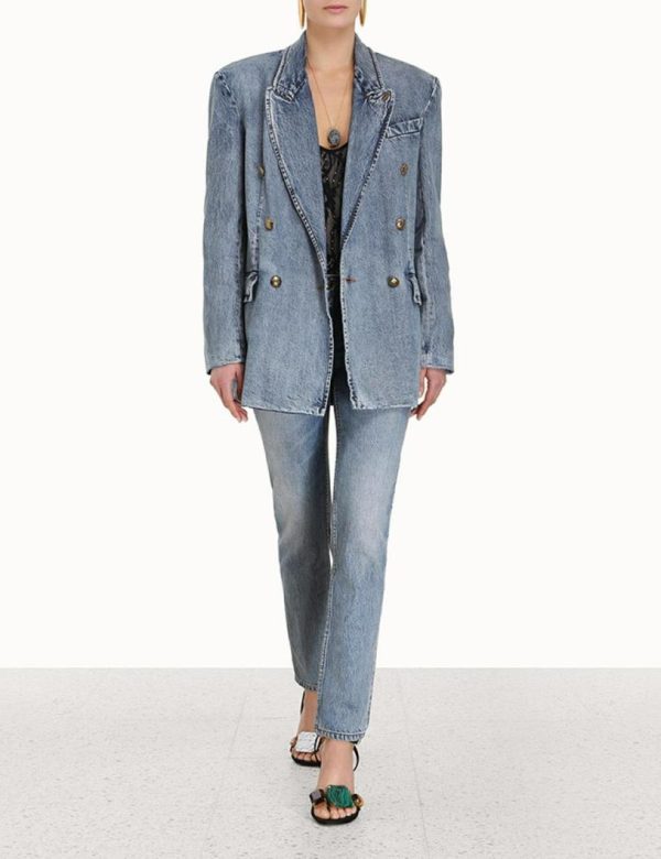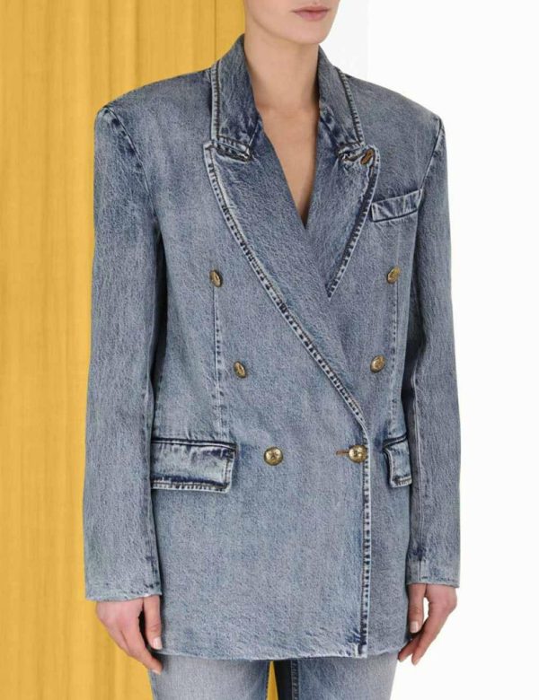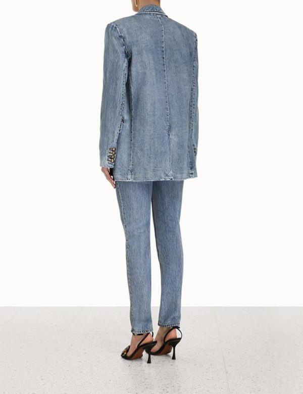 The Luminosity Denim Blazer in Briny Blue from our Fall 2023 Collection, Luminosity. An oversized denim blazer featuring custom printed metal buttons and a double breasted closure.